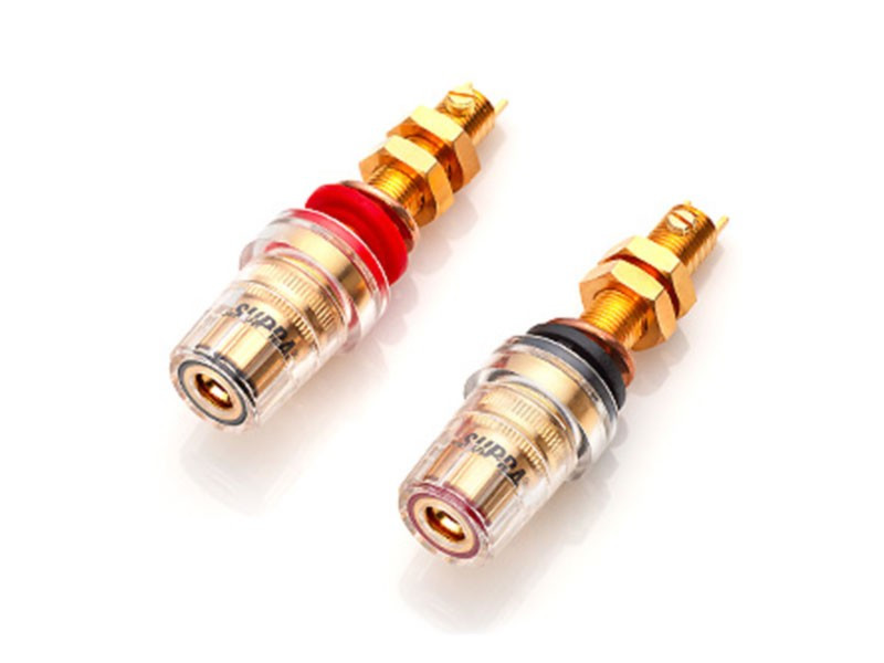 Акустичні термінали Supra BOXCON RED/BLK PAIR BULK призначені для використання з роз'ємами типу "банан" та "лопатка" 8,0 мм. Виготовлені з міді з 24К позолоченим покриттям, мають зовнішній захисний ковпачок із прозорого пластику, червоне/чорне маркування на корпусі. Термінали можуть бути встановлені в стінку акустики товщиною до 29,0 мм і підходять для внутрішнього підключення кабелів з перетином провідника до 10,0 мм методом паяння або гвинтового затиску. Діаметр кріпильного шпильки: 8,0 мм.