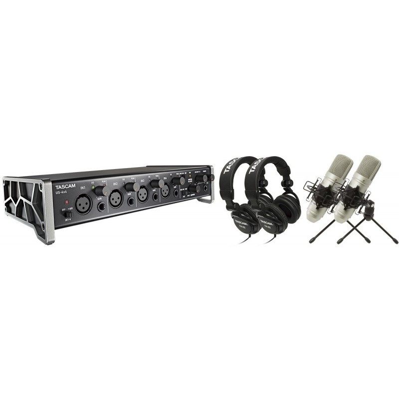 Студійний комплект Tascam US-4x4TP - це набір у складі USB-інтерфейсу TASCAM US4x4, двох конденсаторних мікрофонів TASCAM TM80, двох пар навушників TASCAM TH02, програми Cakewalk Sonar X LE або Steinberg Cubase LE, а також в комплекті Ви знайдете гіга плагінів ефектів. За словами фахівців, Tascam US-4x4TP ідеально підійде для запису акустичних інструментів, таких як гітара, фортепіано чи барабани. Також можливий одночасний запис вокалу та акустичної гітари при використанні двох мікрофонів.